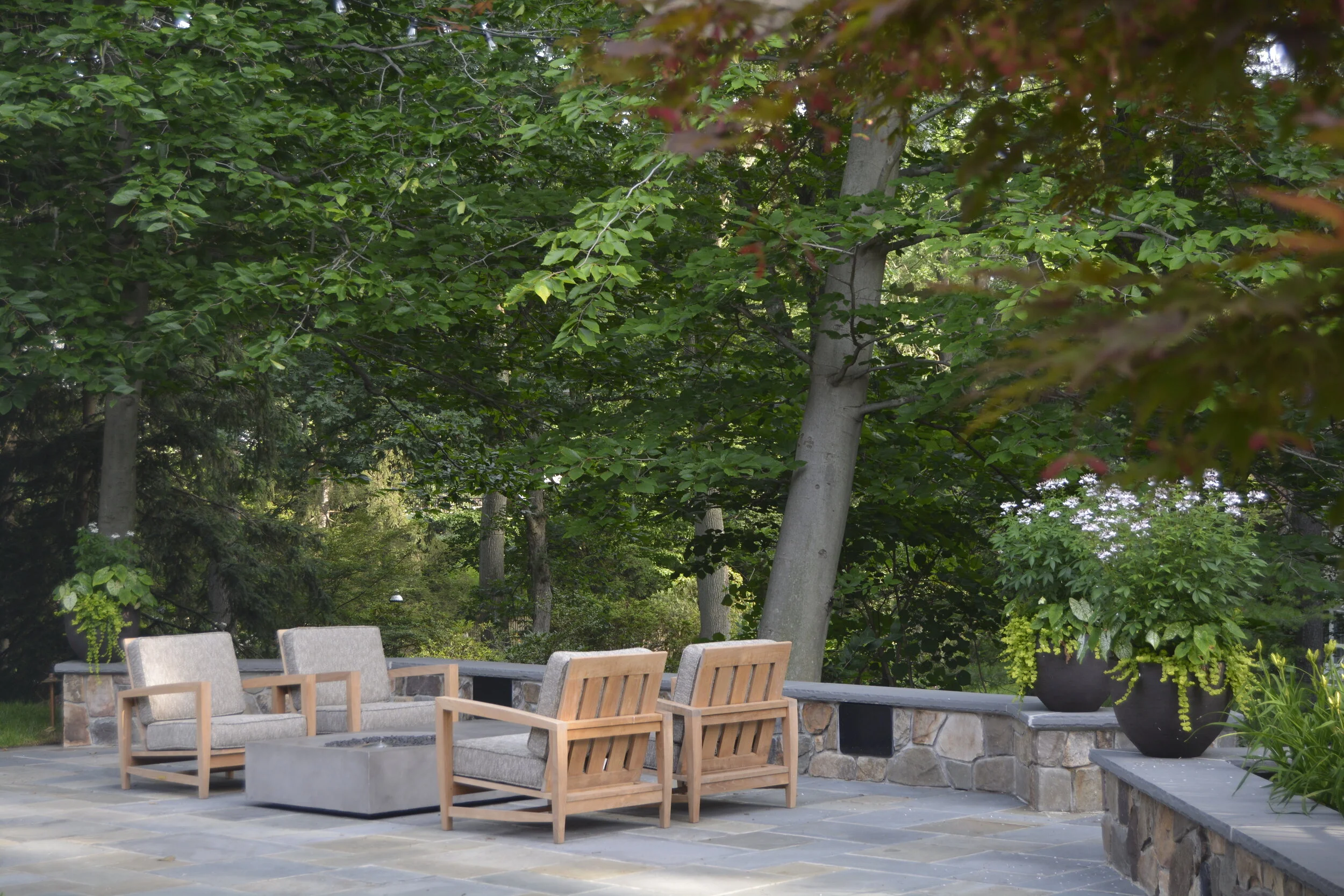 A young family needed safe and practical space in a narrow backyard on top of a steep slope. Contemporary elements were combined with the existing traditional stonework to create zones for entertaining, play and pool. Plantings were designed harmonize with existing hedges and mature trees.
